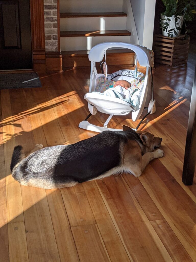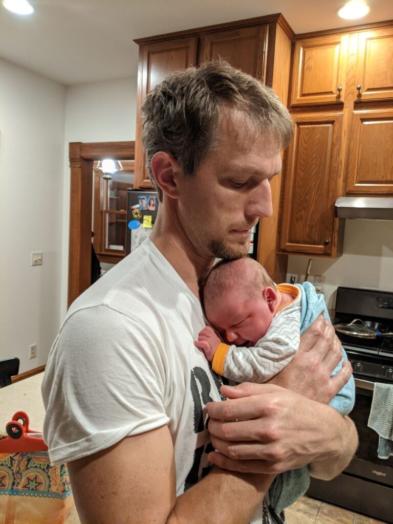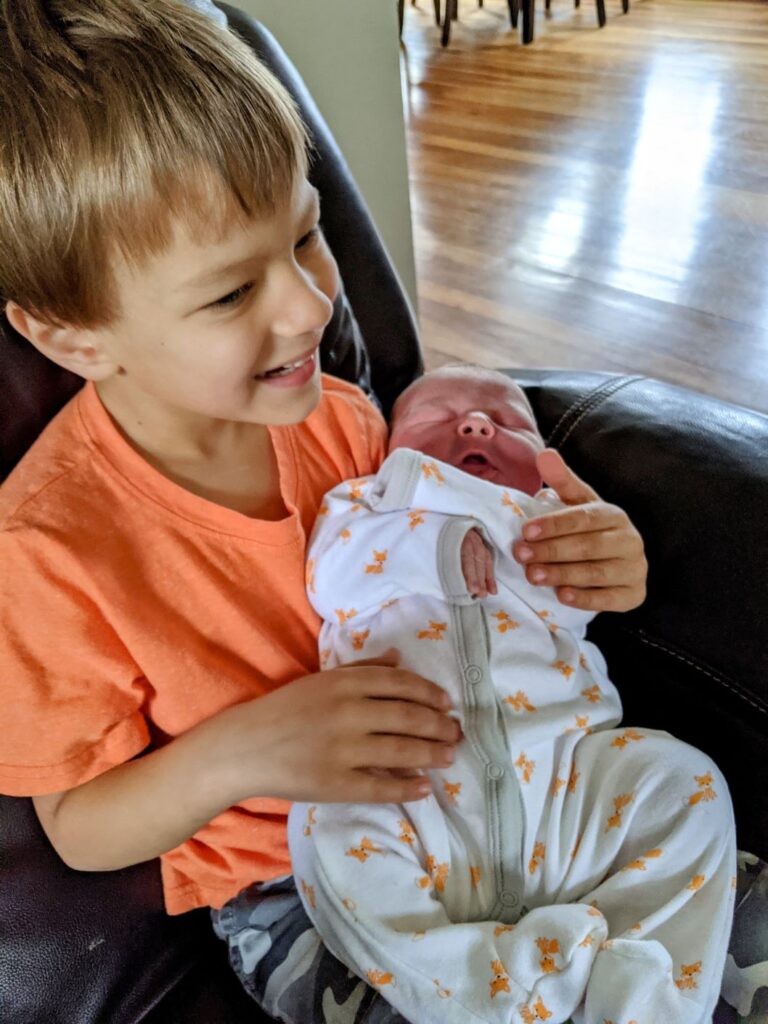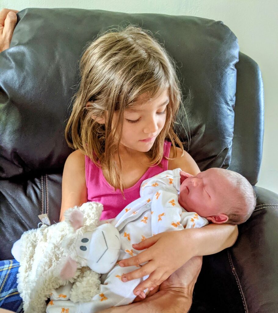 A homebirth gave us the option to involve them as much or as little as we wanted. I figured in Laura Ingalls Wilder days, Ma just sent the other kids “outside to play”, so we’d copy them! Q and H hung out downstairs, while I hung out upstairs. They could hear what was going on (hello paper thin farmhouse walls) and came up to check on me every so often. They stayed downstairs during delivery and ran up right afterwards.