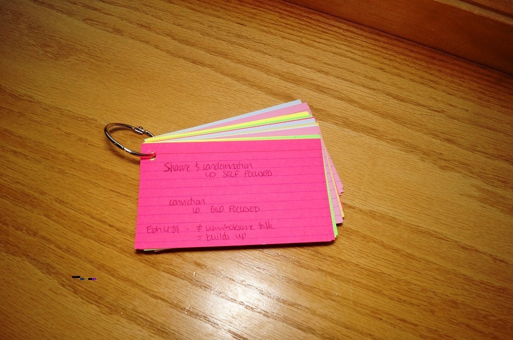 Eventually, there were so many quotes on the wall board we ran out of room. Some of the sayings were so good I needed somewhere else to put them. I dislike piles of papers sitting around – even if the paper is small, so whatever I did had to be “neat”. These colored index cards with a hole punch and key ring were cheap, vibrant, easy to take a couple out to put around the house and easy to put back together!