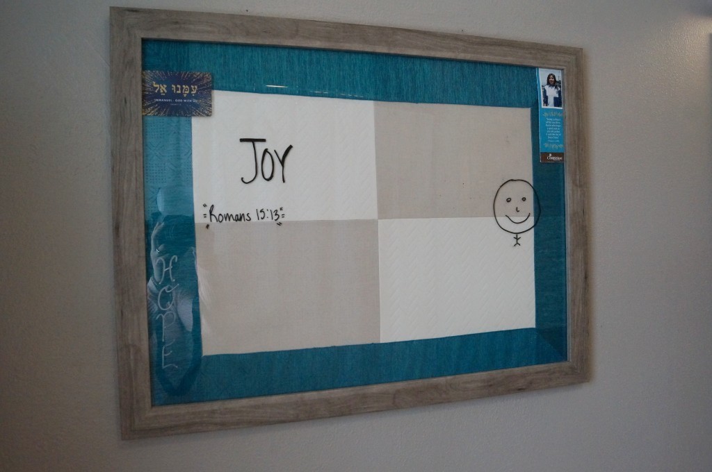 You could pick whatever size and hang it anywhere in the house. This one’s in our bathroom since we see it first thing in the morning, last thing at night, and throughout the day! It’s been up for almost 2 years and the kids and Jason like adding things to it now too!