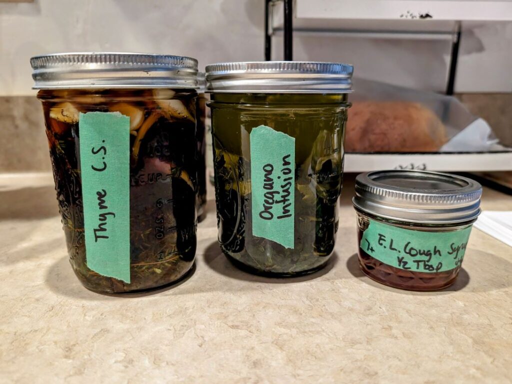 Fill the bottom half of a pint size mason jar with fresh thyme. Add sliced onions and garlic cloves until about three-fourths full. Pour in honey until everything is covered, leaving one inch head space. Loosely cover the jar with a lid and let it sit, out of direct sunlight, on the counter for one week. (Remember the lid is not tight, so be careful if you move it or it’ll leak. Don’t ask how I know this!) Strain and walla! Homemade herbal cough syrup.